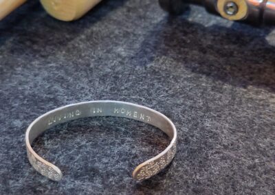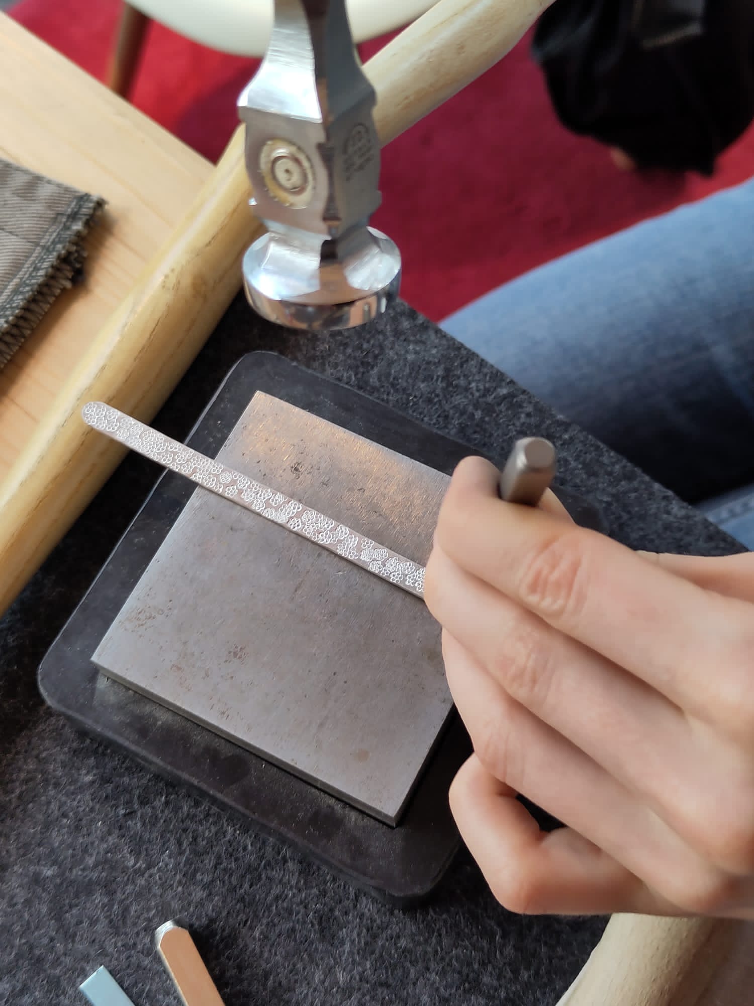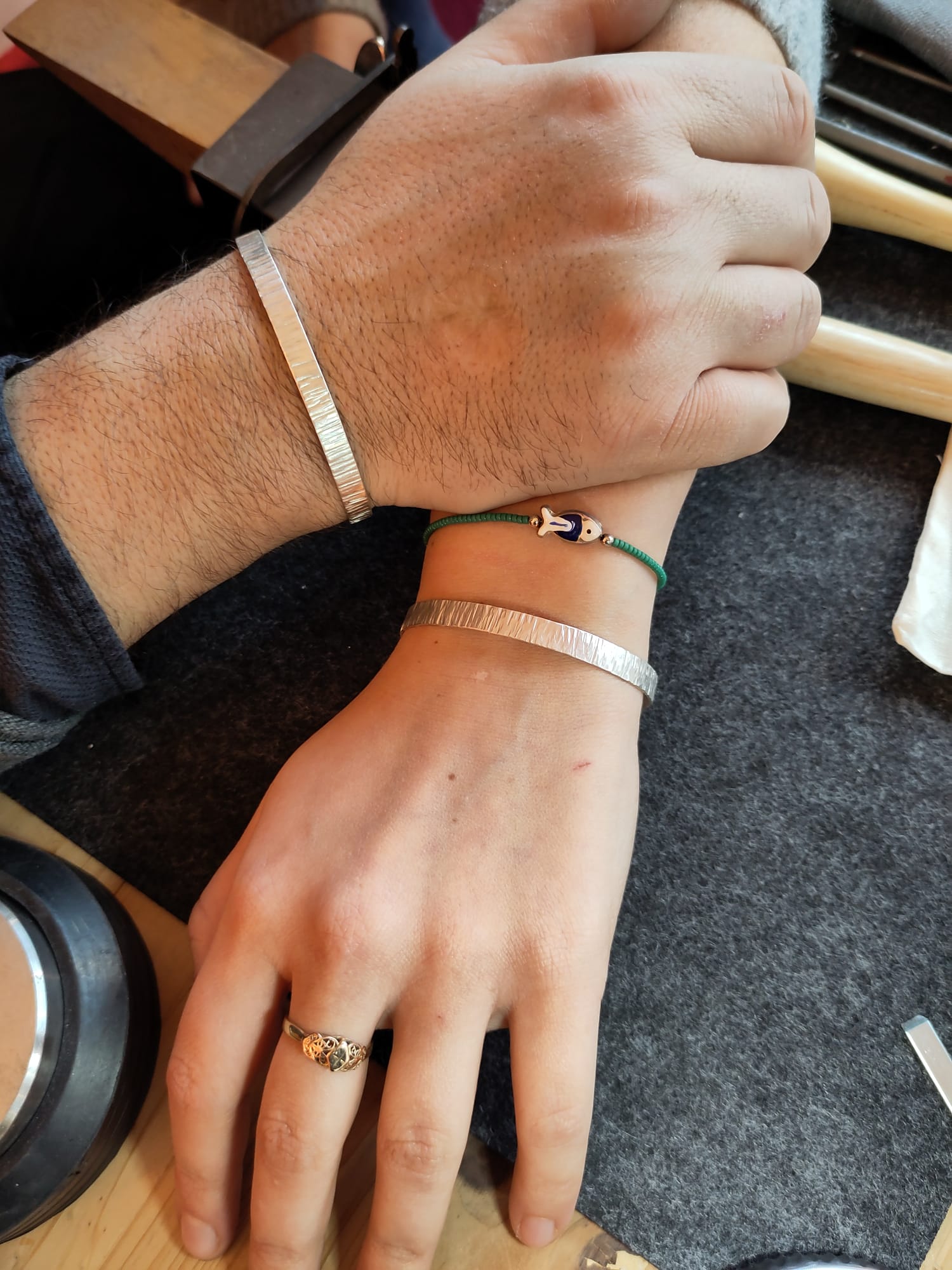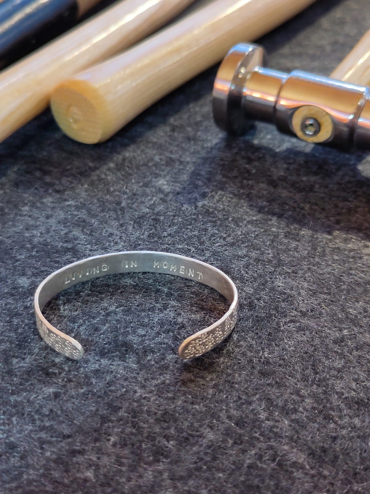 Armspangen Schmiedekurs Schmiede unter professioneller Anleitung deine eigene Armspange mit persönlicher Botschaft aus 925er Silber. Keine Vorkenntnisse erforderlich! Kursgebühr inkl. Material* 120€ Dauer 2,5-3 Std *Breite des Materials 5mm Sonderwünsche bzgl. Material oder Motiv erfordern eine vorherige Absprache von mindestens einer Woche vor Termin. Eine nachträgliche Vergoldung kann ebenfalls gegen Aufpreis ermöglicht werden.