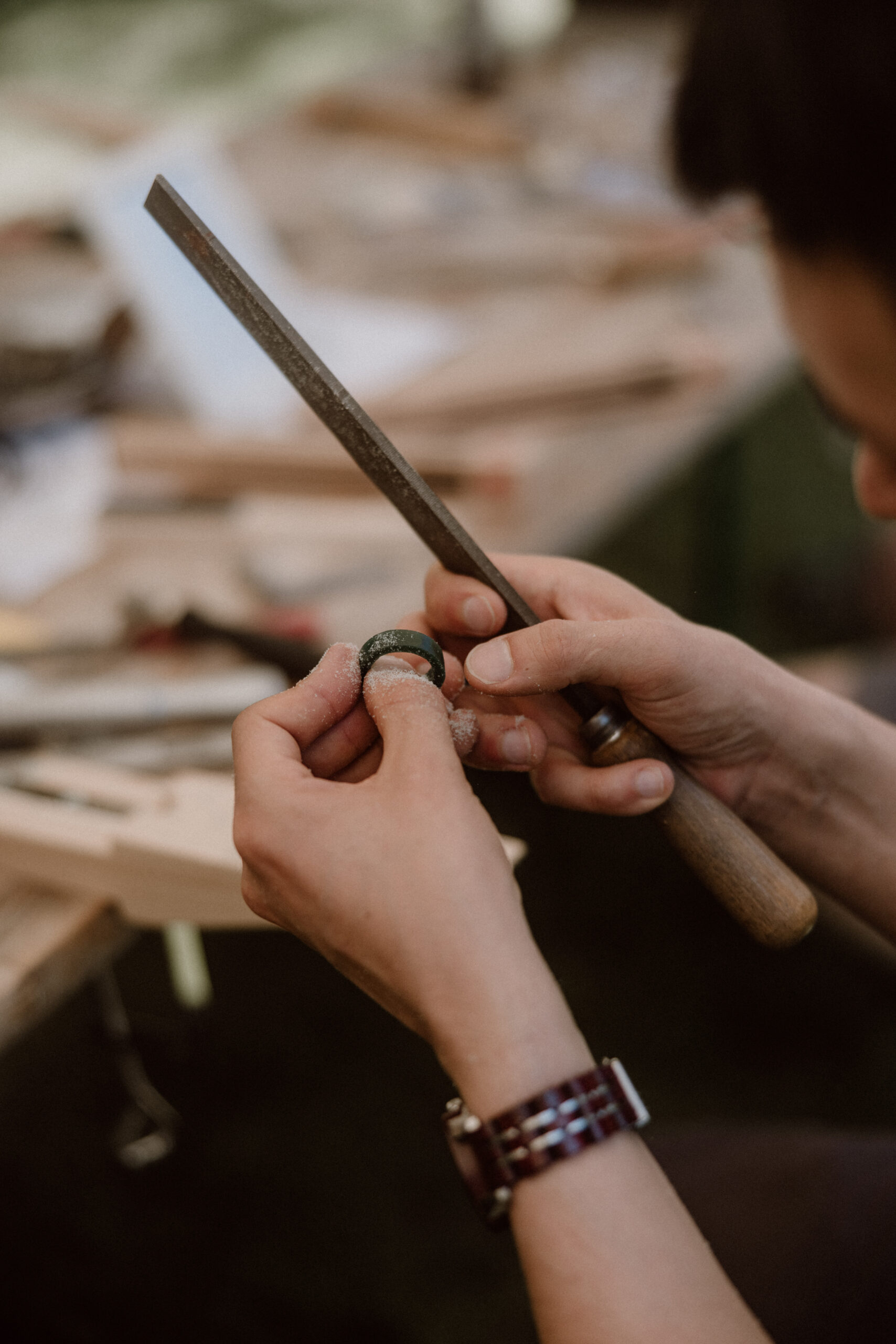 Bis heute arbeitet Rouven mit den originalen Werkzeugen und Maschinen seines Großvaters. Seine Schmuckstücke entstehen auf traditionelle Weise in 100% Handarbeit – als Einzelstücke, fernab von Massenproduktion.