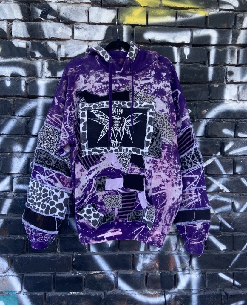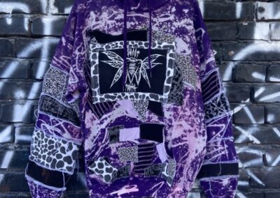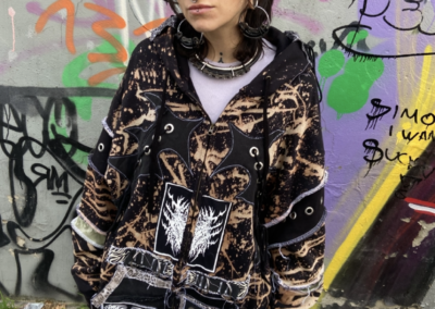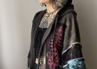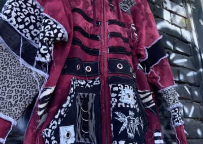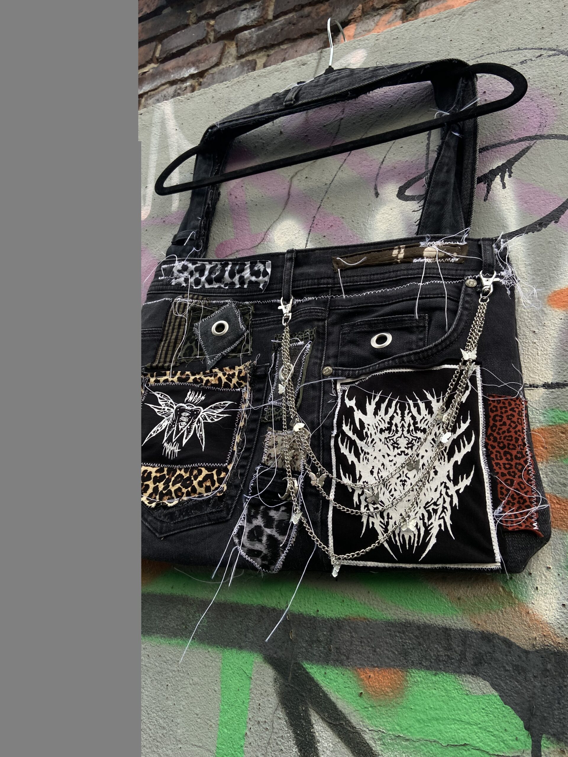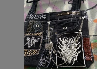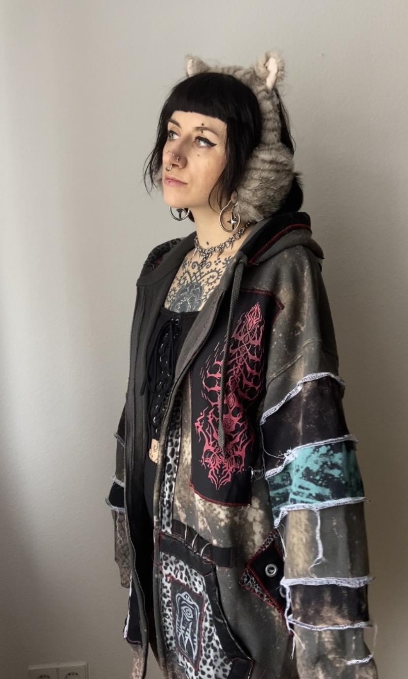 Ich arbeite mit recycelten Materialien, Patchwork und Siebdrucken aus eigenen Zeichnungen.